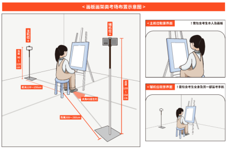 考生须面向墙壁放置画板、画架或桌椅,墙壁不得带有转角,不得故意设置监考盲区。考生须按下列图示要求布置考场,提前调试拍摄距离和光源,确保2部手机的录制画面清晰,录制界面与图示取景界面一致。