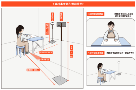 (二)使用桌椅考场:主机位于桌面正前方,辅机位于侧后方。双手须放置在桌面上,且考试全程均在主机视频可监控范围内。考场布置示意图如下: