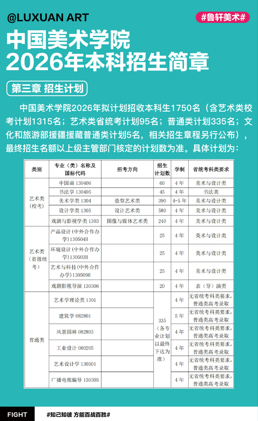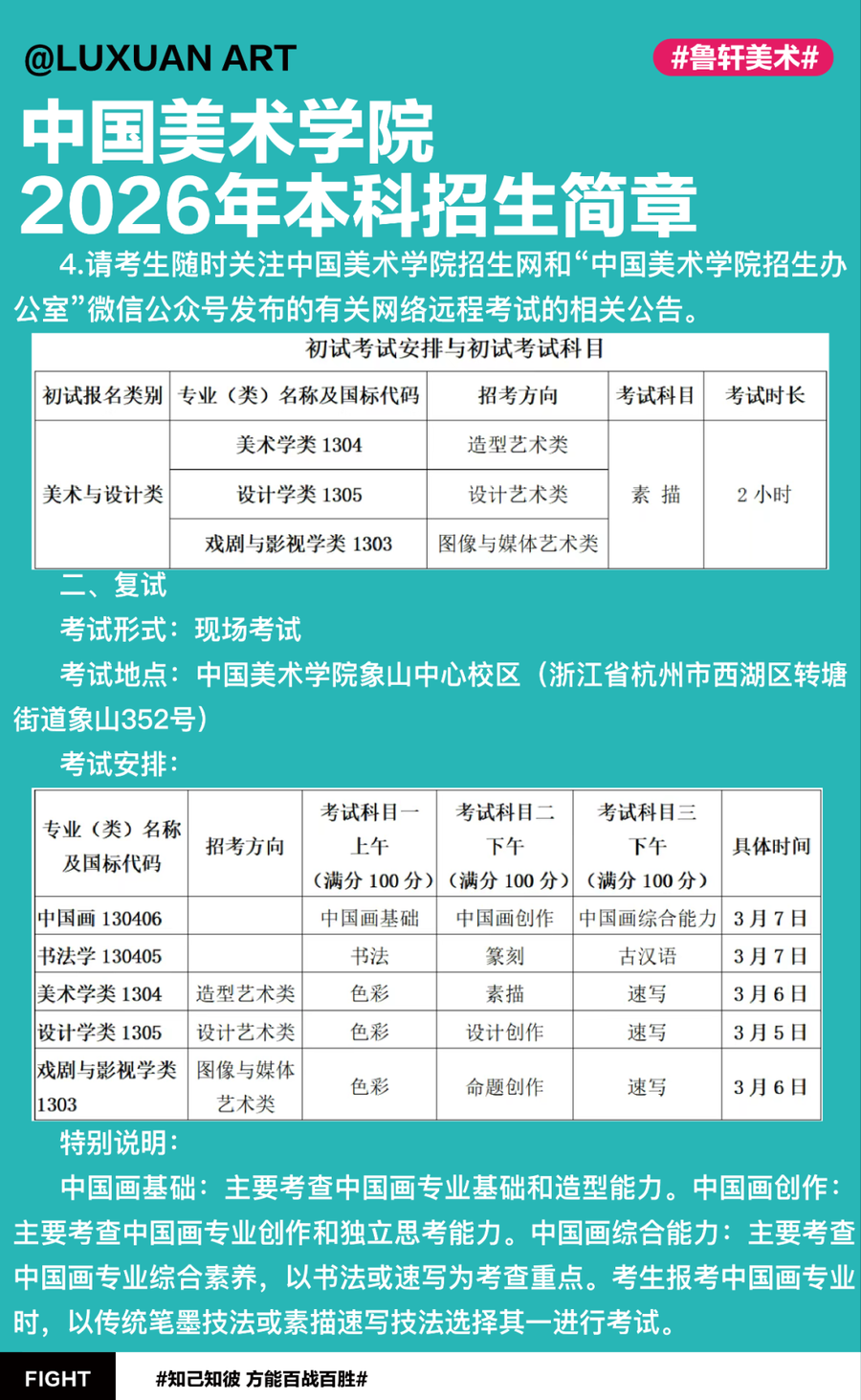 最新资讯 | 中国美术学院2026年本科招生简章已发布!1月12日-13日初试!