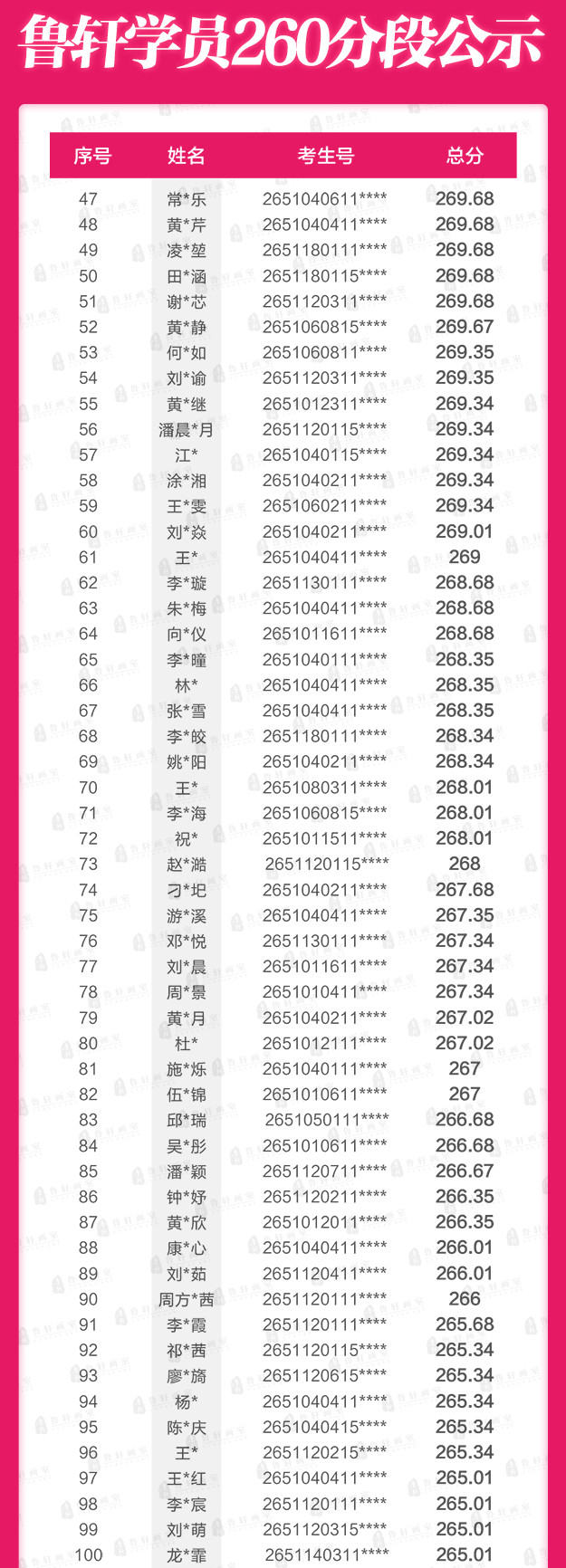 270分以上鲁轩霸榜46位,独占全省该高分段的13.86%,全省每7个270+超高分,就有一个出自鲁轩!七分之一!
