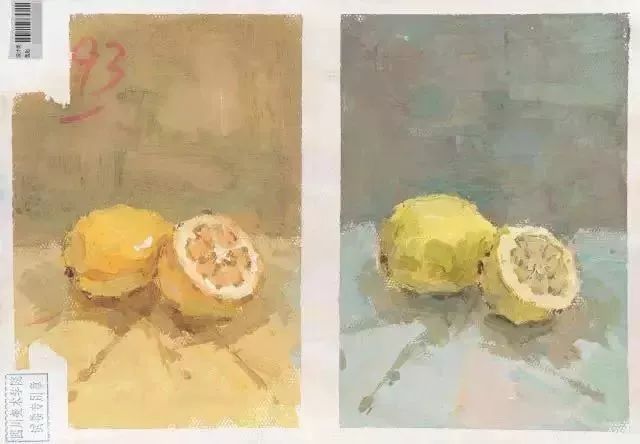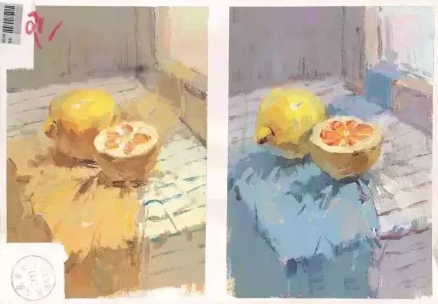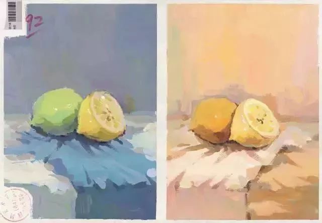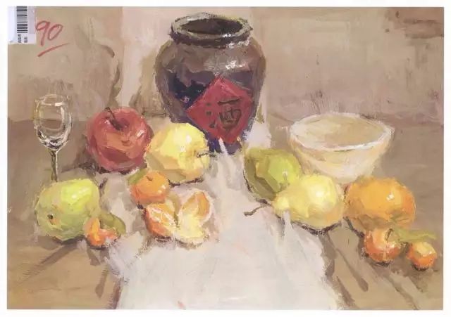 ▲名师点评:该色彩考卷呈现该考生对水果造型与色彩关系的综合把握能力,水果的色彩关系和用笔富有绘画性,色彩色调表现生动,富有绘画气质。白色衬布的近处如果有明度更亮一些的笔触会更好,白瓷碗的色彩关系缺少了冷暖的变化,高脚杯和白瓷盘的刻画显得草率而不得法,这是该试卷的不足之处。