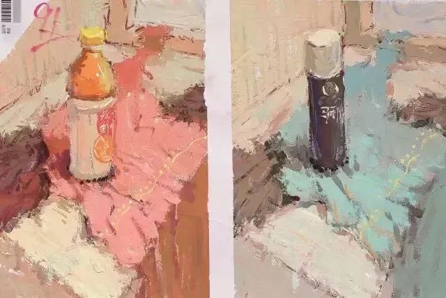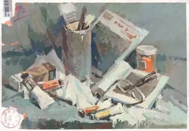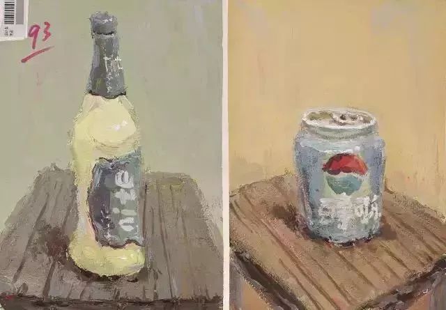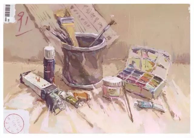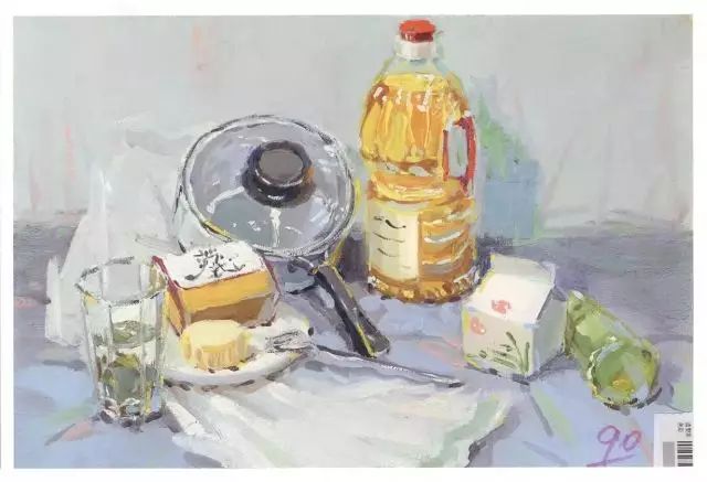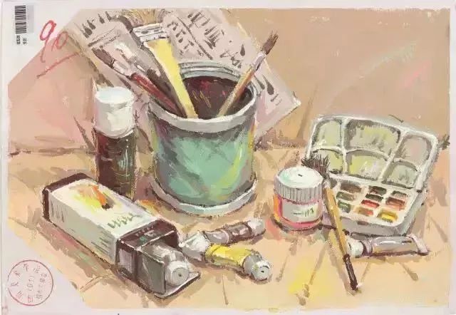 ▲名师点评:这张色彩考卷可体现出考生对静物的造型与色彩组织关系较为明确。背景与台面的色彩呈现较为单纯,烘托静物的大小高低错落关系,几块黄色的运用使画面更为响亮,物体的投影关系处理得十分妥当,主体部分的刻画很到位,形体与色彩推移处理得很生动。物体的高光刻画强化了质感,书写式用笔使画面既有塑造感,又有绘画性。这是初学绘画者难得的造型能力,该考卷的不足之处是食用油桶投在背景上的影子刻画得生硬了,色块之间的转换也缺少了一些韵味,可结合湿画法强调出空间的虚实关系,使色彩静物呈现出更多的绘画魅力来。