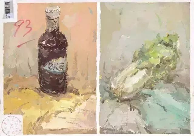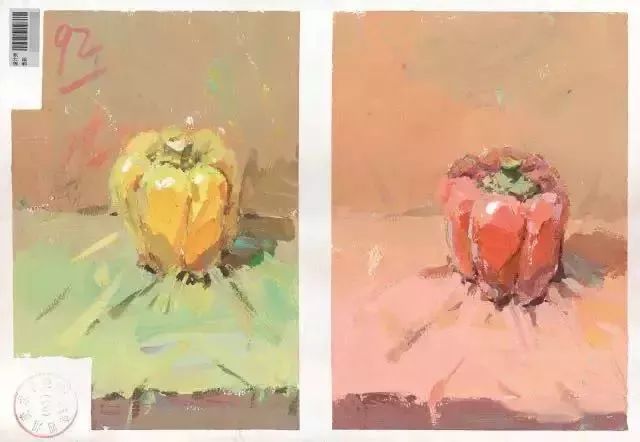 ▲名师点评:现在的考生考试前都将颜料调好,从类色到对比色。这样有可能提高作画速度,但也扼杀了考生们的调色能力,对色彩的主动感受能力和把握能力。我们从这张考卷可以看出考生是在平涂色彩之上做了一些色彩变化处理,但衔接得不是很自然,色彩层次显得单薄了。好在物体的刻画还算有一定的深度,掩盖了其画面层次单薄不足。