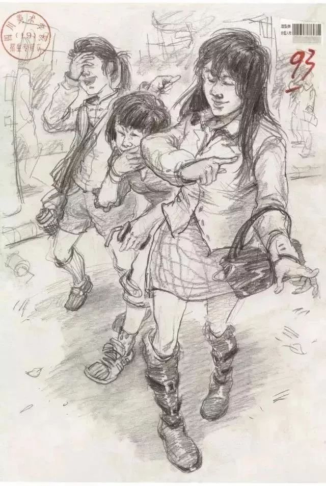 ▲名师点评:对于命题创作而言,重要的是把握题意要点,同时要敢于发挥自我优势,此画就是其代表之一,试卷 紧紧抓住试题”三个少女姗姗走来” 和“步履轻盈”、 “仪态大方”这些要点,生动塑造了三个神态各异的少女形象。在动态设计上,三人相互照应,顾盼生辉,较好地达到了“人物组合”之“相互关联”的要求,形成了画面的整体构成。用笔较肯定、松动,具有较强的速写感。不足之处:前面女生上身衣纹和背景稍显零乱。