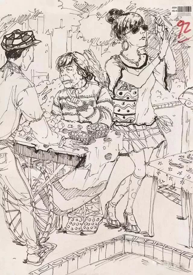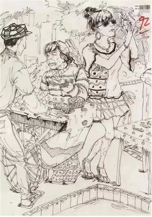 ▲名师点评:该卷最大的优点在于钢笔用线流畅、 劲挺,而且体现了线条自身的 “独立美感”,即有较强的表现力。不仅“以线造型”准确,画面疏密有致,线型流动充满了韵律感,三个人物形象的塑造也颇为生动。不足之处:背景过于潦草,且略显零乱。特别是画面前端的三角形地面破坏了构图的完整性,有“画蛇添足”之感。