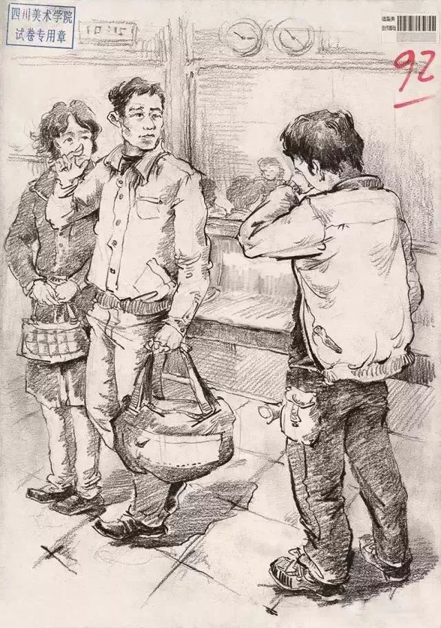 ▲名师点评:试卷表现“中考”的主题。试卷优点:通过人物形象的塑造,生动地再现了考场外家长焦急等待的情景。借助凝重的色调和光影,有效地烘托了考场外紧张的气氛,家长“ 焦急的心情溢于言表”。构图完整,人物组合关系得当,动态生动,形体结构准确。特别是人物面部表情各异,刻画深入细腻。作者有效地借助手握凉扇这动态细节,暗示人物焦急的内心活动,可谓构思巧妙、匠心独具。不足之处画面右前方妇女盘着的双魅动态略显雷同,且双脚与底线过于平行。
