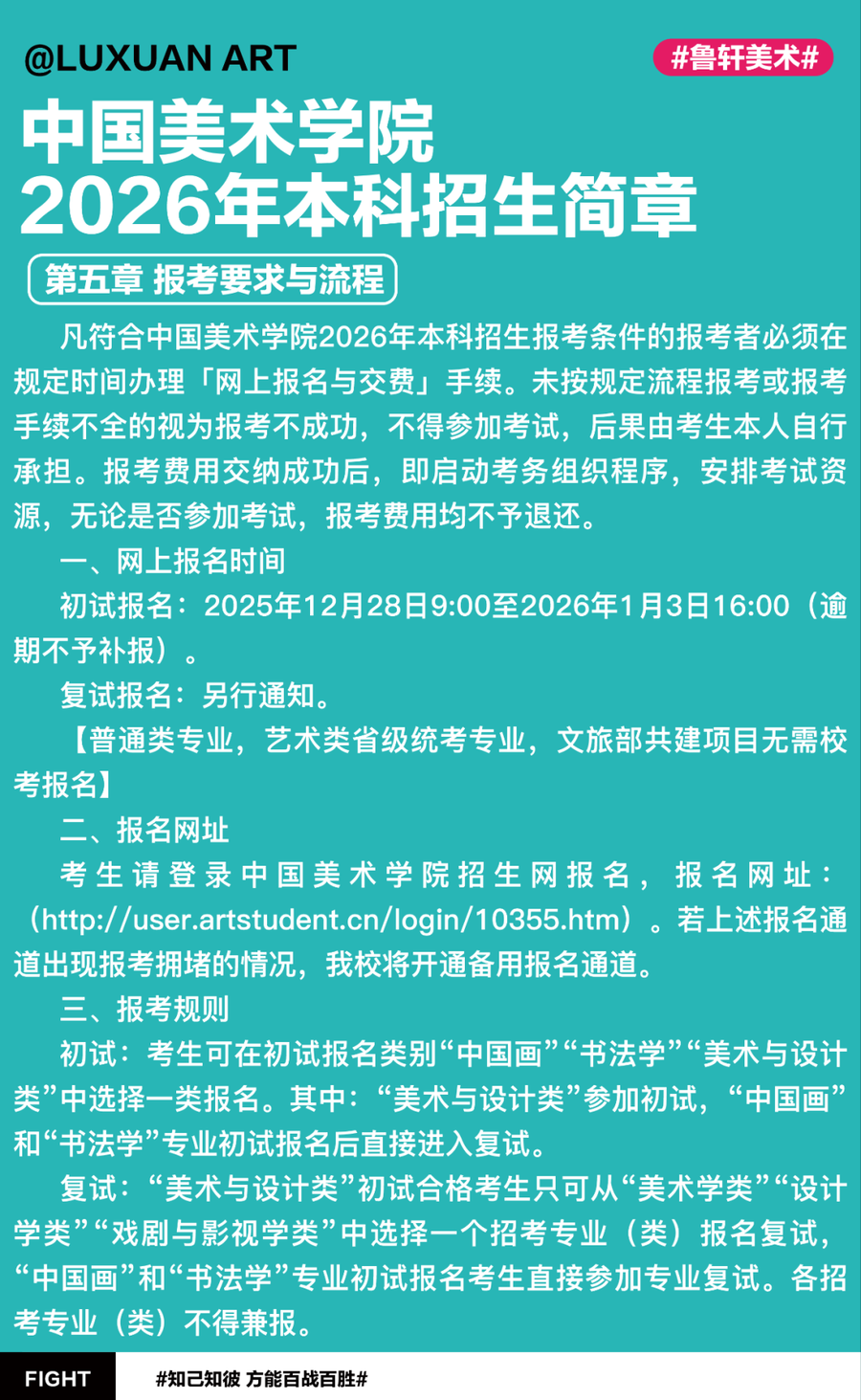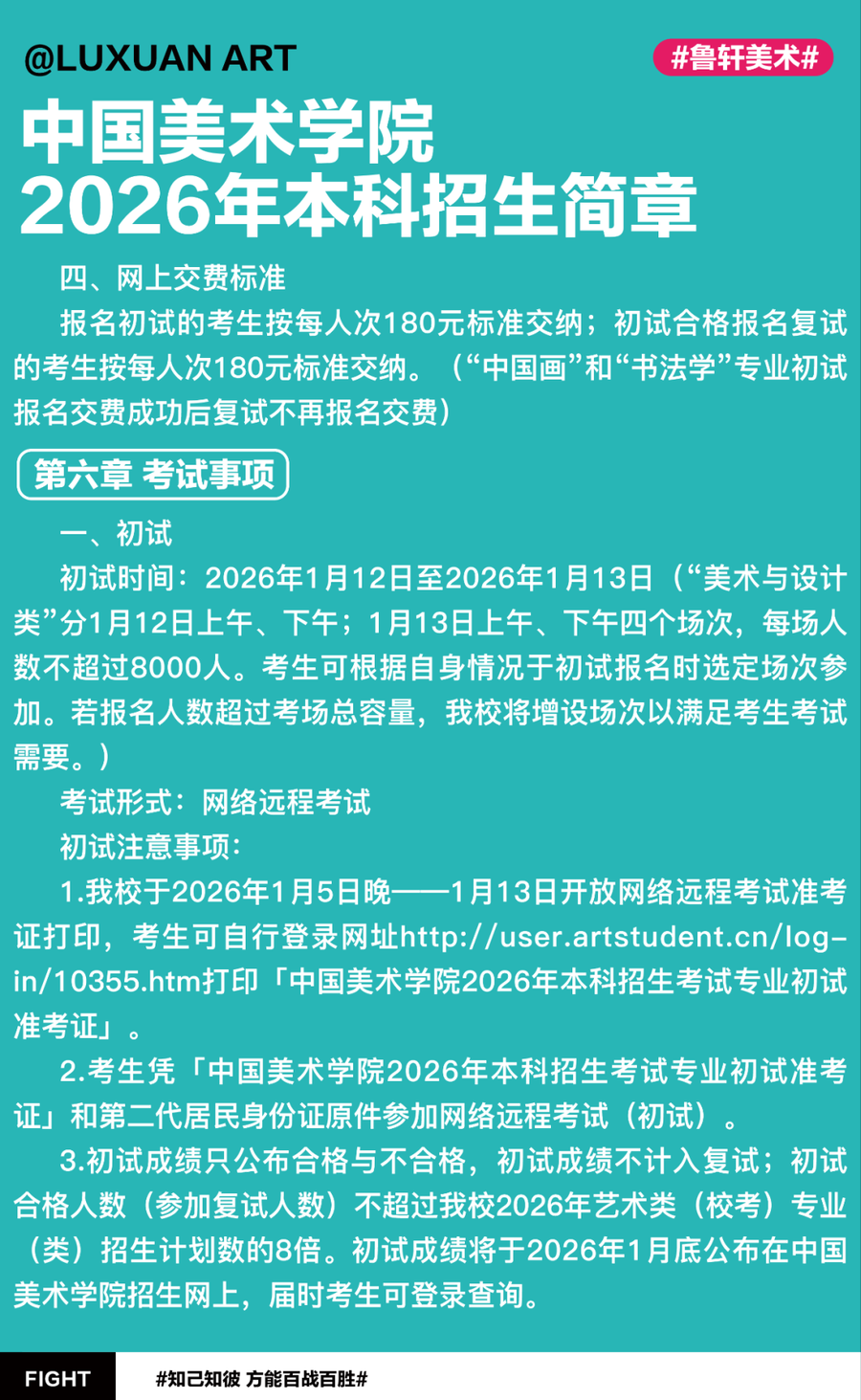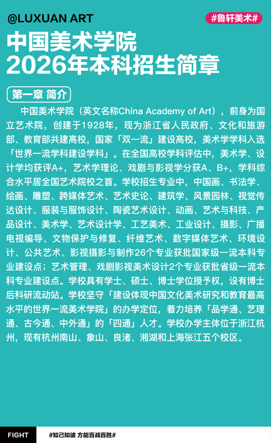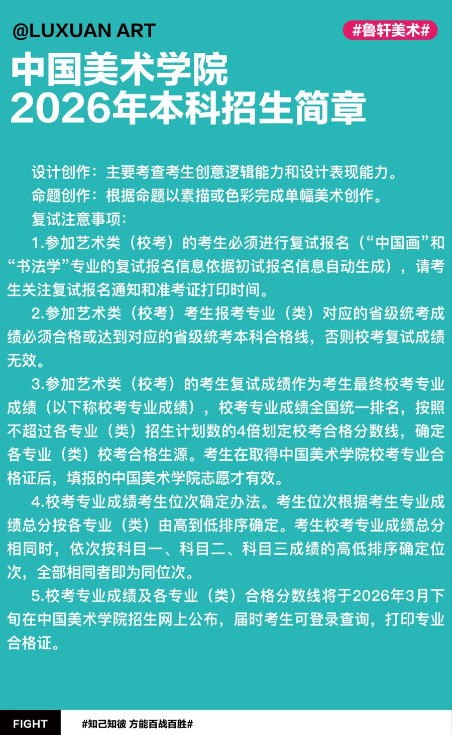 最新资讯 | 中国美术学院2026年本科招生简章已发布!1月12日-13日初试!