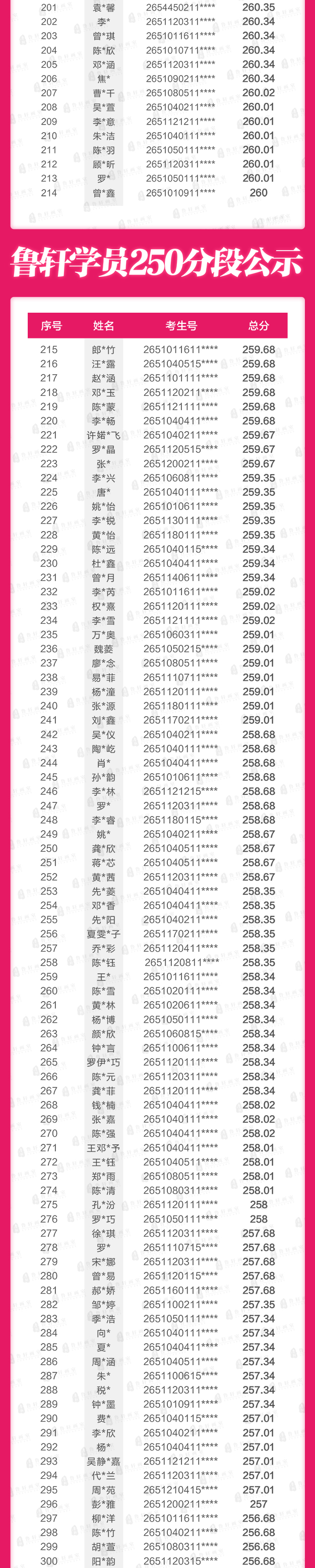 260分以上鲁轩霸榜214位,独占全省该高分段的11.74%,全省每8个260+高分,就有一个出自鲁轩!八分之一!