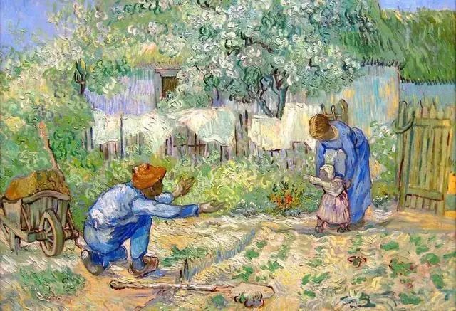 《人生第一步》 是梵高向米勒同名画作的一次致敬。画面是一块农村的耕地,背面是农民的房屋;画的右方一位农妇扶着女儿帮助她学步;左方女婴的父亲蹲在地上张开双手鼓励她向前走。