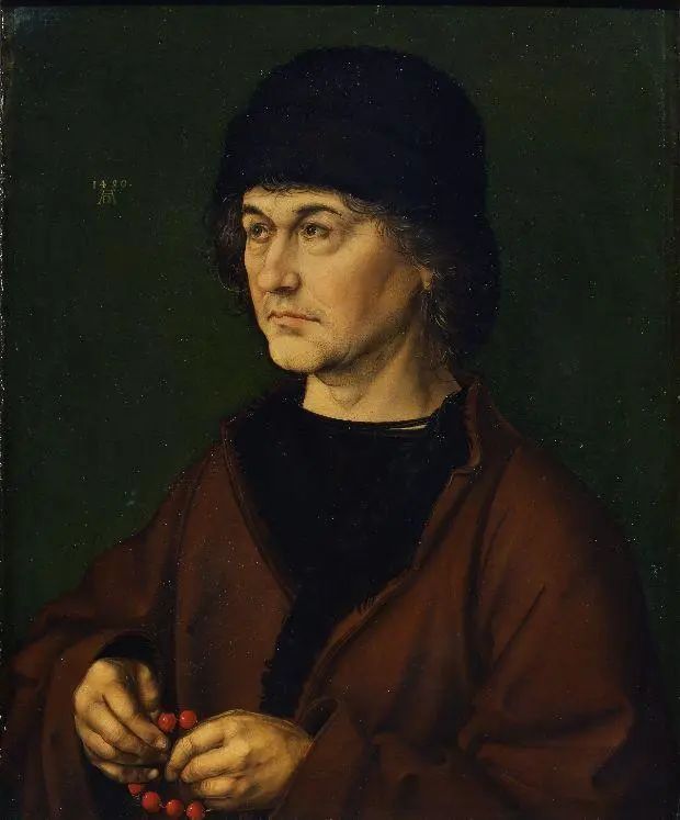 丢勒一生为父亲创作了两幅肖像(此为第一幅)。创作这幅作品时丢勒年仅19岁。他从侧面的角度入画,采用细腻写实主义手法,刻画出了“严父”的风采。敏锐的目光透出威严,在严肃中隐约见出仁慈和宽容,可见他在儿子心中具有非同凡响的地位。