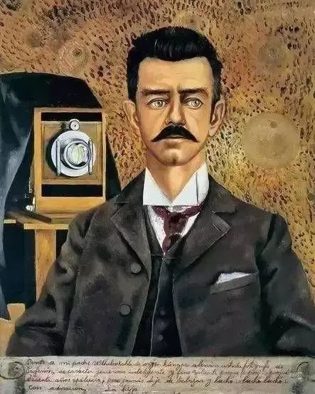 弗里达·卡罗是墨西哥著名画家,她的父亲是个拥有匈牙利犹太血统的德国移民,也是墨西哥城当地颇为有名的摄影师。1951年弗里达给父亲在他的相机旁画了这张肖像画,她认为父亲作为很好的榜样影响着她。