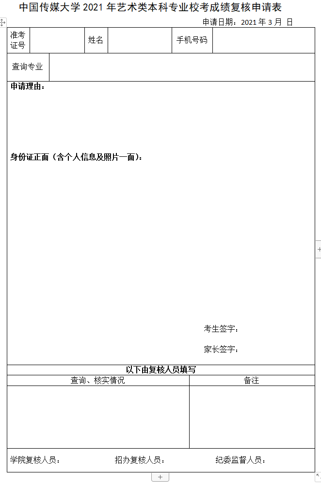 中国传媒大学2021年艺术类本科专业校考成绩复核申请表.docx (点击【阅读原文】下载)