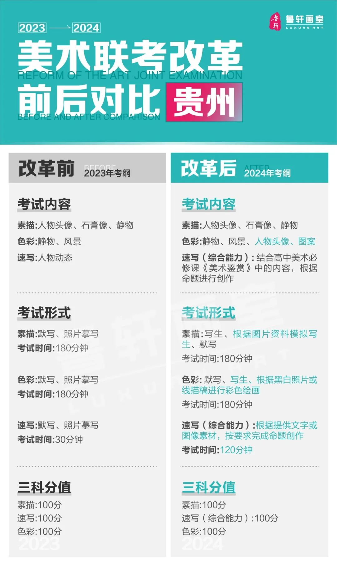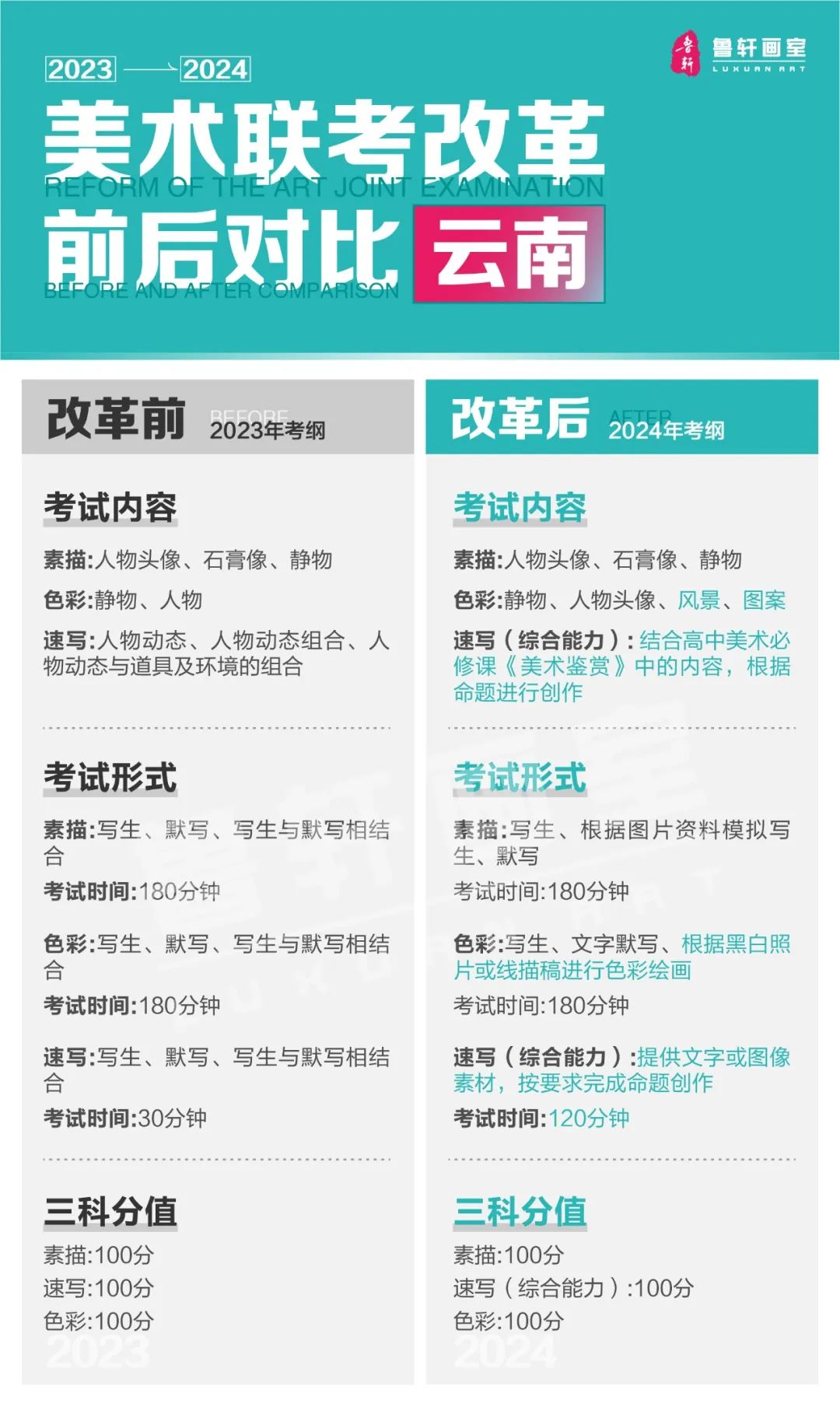 联考改革,三科的考试范围扩大(素描、速写、色彩),不再局限于单一的考试内容,变的多样化。尤其是速写,更名为【速写(综合能力)】,考试时间由30分钟变为120分钟,彩头、命题创作等在校考中才能见到的词汇也出现在联考考题中,联考考题正往校考方向靠拢。