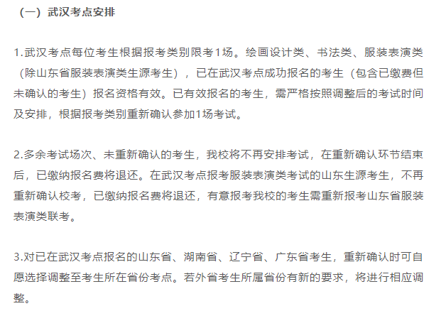 4.考试时间确定后,对已报名未参加校考的考生重新开通网上确认,考生重新选择考点或放弃报考,对放弃报考的考生退还报名费,考试具体时间及安排、网上确认、退费等事宜另行公告。