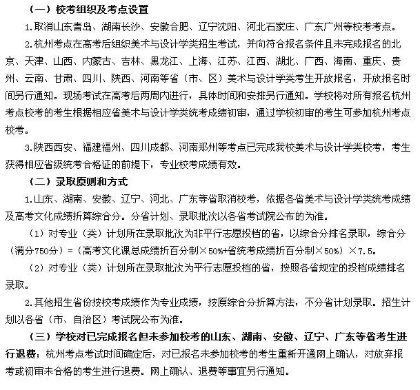 除浙江、河南、四川三个已经设点完成校考的省份外,其余招生范围将投放美术与设计类专业分省计划,使用美术省级统考专业成绩,按照“综合成绩=美术省级统考专业成绩+高考文化成绩”原则进行录取,对于相关已缴费考生,我办后续将妥善办理退费手续。