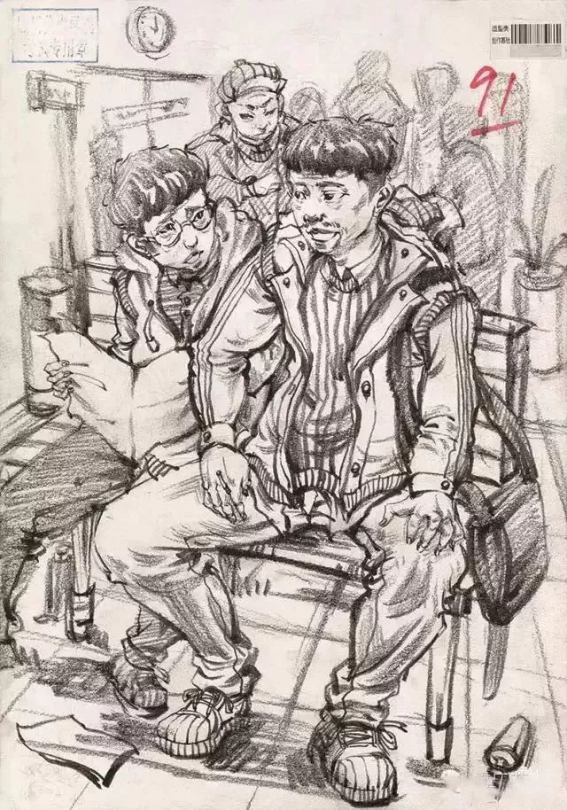 ▲名师点评:该卷最大的优点在于钢笔用线流畅、 劲挺,而且体现了线条自身的 “独立美感”,即有较强的表现力。不仅“以线造型”准确,画面疏密有致,线型流动充满了韵律感,三个人物形象的塑造也颇为生动。不足之处:背景过于潦草,且略显零乱。特别是画面前端的三角形地面破坏了构图的完整性,有“画蛇添足”之感。